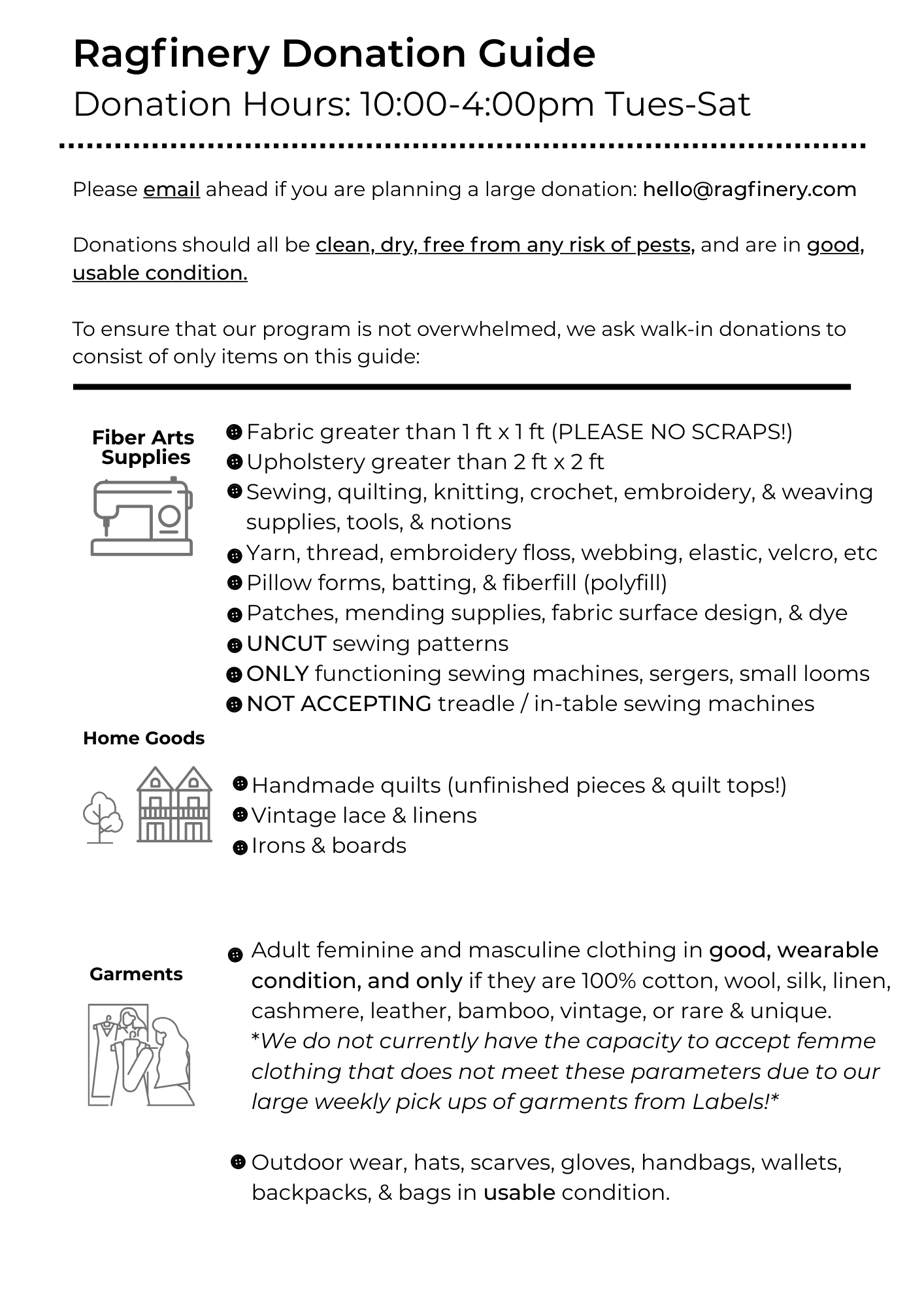 Please limit donations to 2-3 boxes/bags MAX per drop-off! We want your stuff, but we also want to accept from as many folks as we can. Share the love by keeping your donation runs light, but frequent!
