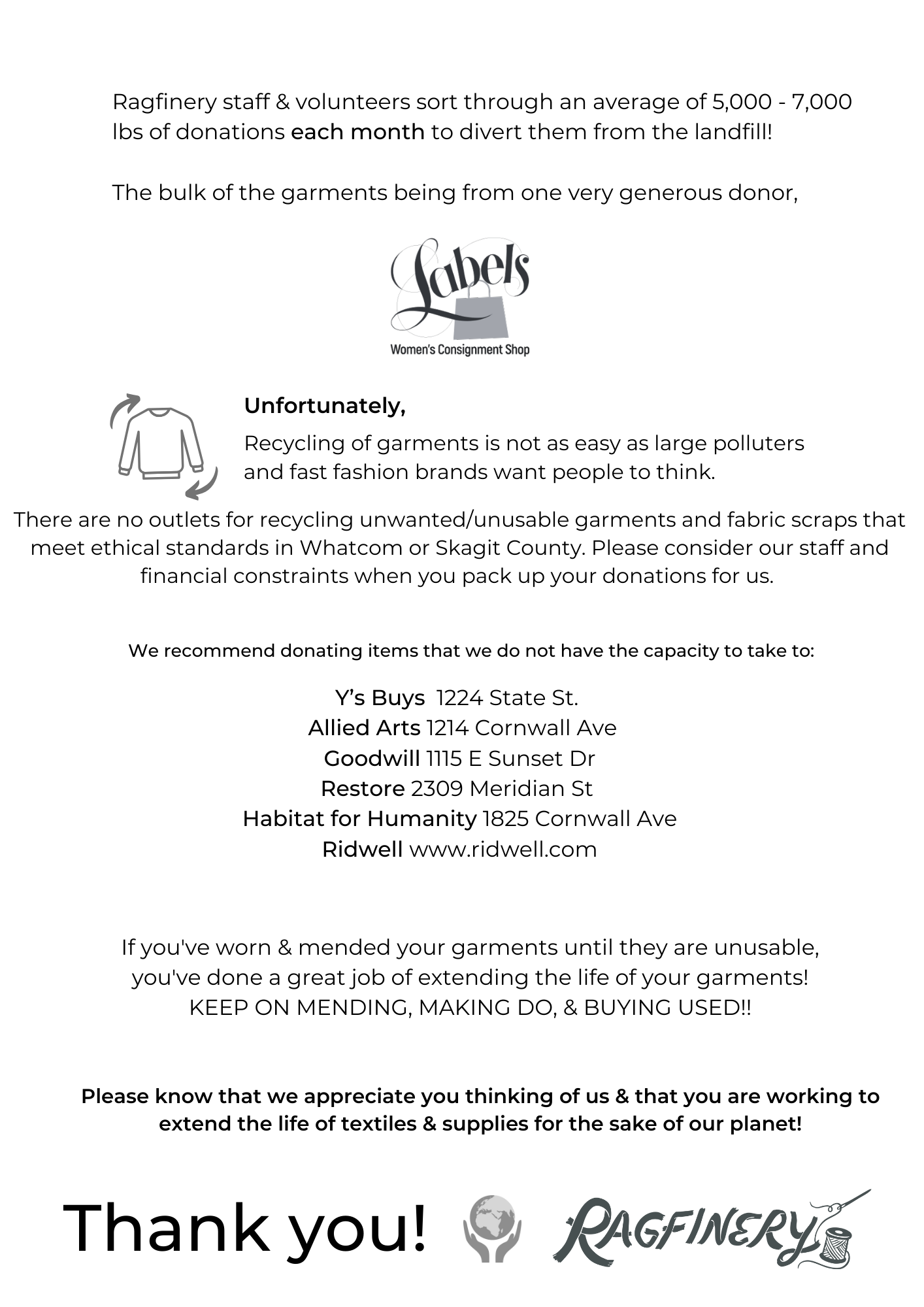 We are no longer accepting bedding or drapery donations! Unfortunately, we don’t have the capacity to accept or sanitize these bulky donations. We recommend bringing them to the Whatcom Humane Society Thrift Store, who accepts used sheets/blankets/curtains in good condition!!! Their donation hours are Tuesday-Saturday, 10-4.